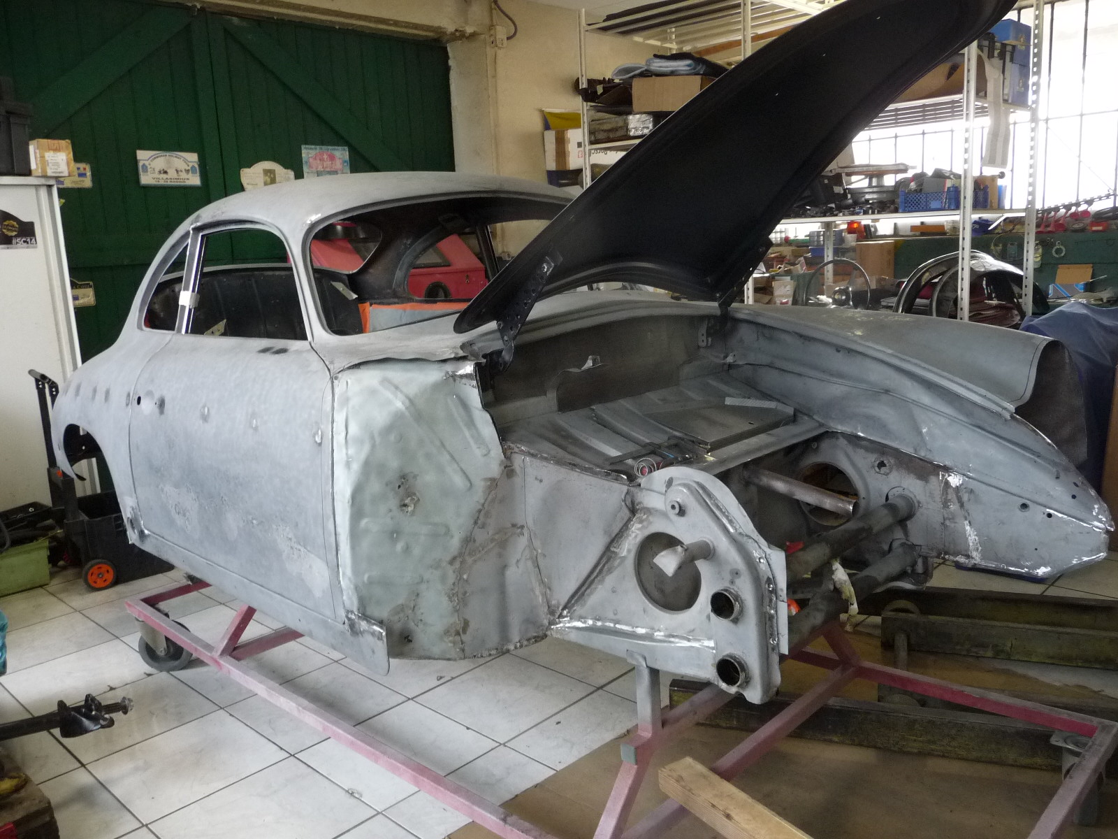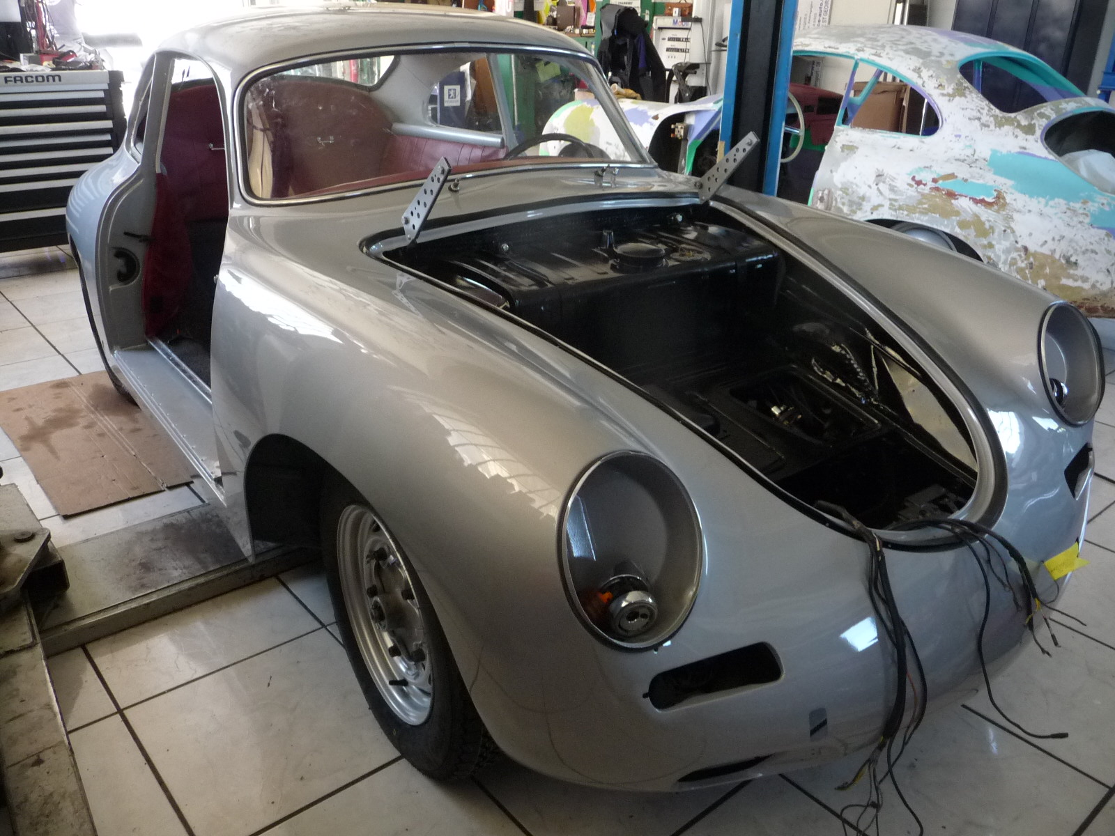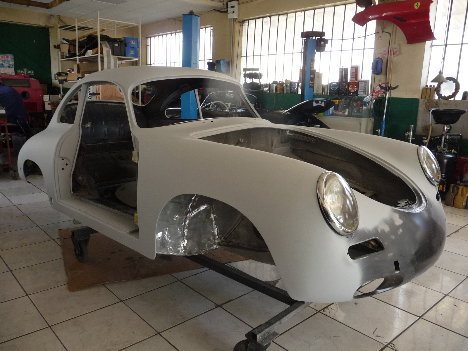 Recontruction complète de cette Porsche 356 de 1960 modèle BT5 passage au marbre de controle chassis remplacement des elements de tolerie av reconstruction de tolerie divers